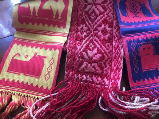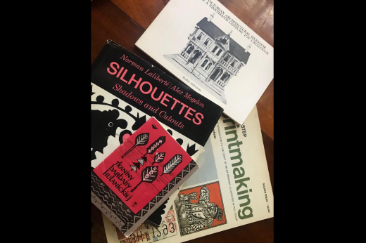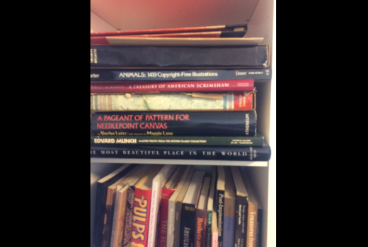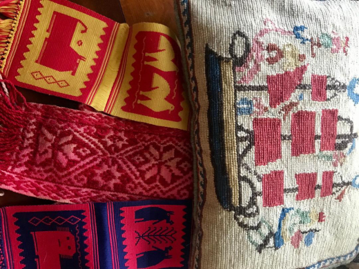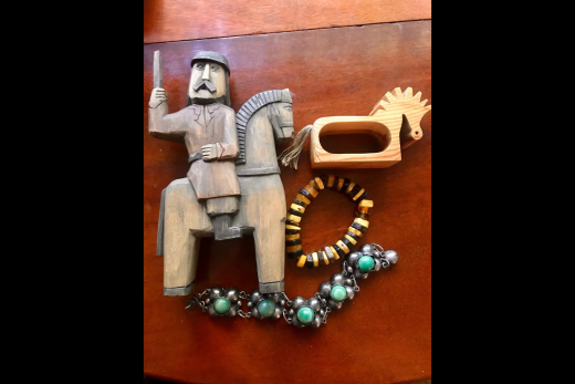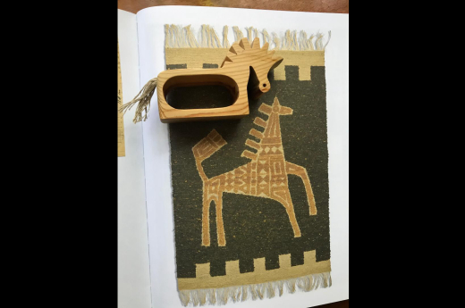 When I got home, I unpacked my small bag of curious objects and half wondered what on earth I was thinking choosing this odd mishmash of things. There were several craft and printmaking books, including a little portfolio of postcards showing the weavings of a midcentury Polish textile artist. I had grabbed a copy of a little book about Victorian dollhouses written by Evelyn Ackerman in 1980. I bought a couple pieces of Evelyn’s jewelry including an amber bracelet and lovely a 1940s Mexican repoussé silver and jadeite bracelet that I know I’ll wear often. I chose some small, woven textile pieces that appealed to me because of their colors and designs. I bought a single, Swedish wooden napkin ring in the shape of a horse, (partly because it reminded me of the Swedish rocking horse my mother bought for me when I was a child). Also in my bag of were a wooden folk art carving of a mustachioed man on a horse, and a wonderful gold cat plaque which I had returned to again and again. The cat is elongated and stylized, and made of papier-mâché painted with gold. It was with a group of similar pieces which were clearly made by the same artist (apparently) in Murano, Italy. A Greek needlepoint cushion with a ship design rounded out my estate sale bounty. An odd array of hastily selected objects indeed!
