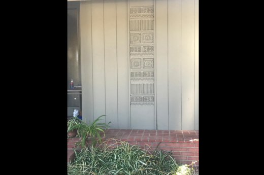 I had not been to an estate sale in many months, in fact I had barely left the house. I can’t say I wasn’t nervous but I knew this would be special, so on the first day of the three-day sale, I donned my mask, face shield and hand sanitizer and stood in a socially distant line for 2.5 hours. The estate sale company was only letting a few people in at a time. Safety precautions were in place and being carefully adhered to. I waited under the shade of a huge peppercorn tree on the front lawn of the modest, Culver City tract house that belonged to the Ackerman family since 1956. One of Evelyn’s carved bas relief panels was installed on the exterior of the house.