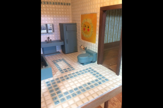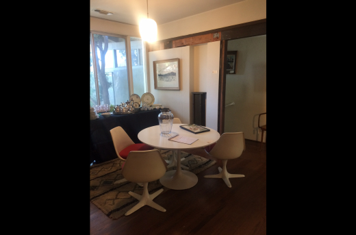 It felt almost like visiting a house museum — one that was open to the public for only three days. It was akin visiting the Eames house, frozen in time as Ray left it when she passed away. It was magical to be in their home and see the attached backyard studio where so much of the Ackerman’s work was imagined and created. Among the items for sale in the studio was a wonderfully detailed dollhouse that Evelyn built for her daughter Laura in 1958. Their books and collections were still on the shelves, their dishes were still in the kitchen, their artwork was still on the walls and there was still a bedspread on one of the beds as though it had been made that morning. There was beautiful furniture in the house, both Danish and American. The wooden floors were covered in a combination of Persian, kilim, Native American and Scandinavian rya rugs. Sections of the kitchen walls were paneled in frosted glass and wood and each light fixture and lamp in the house was different. The large back patio was filled with potted spider plants and there was a work bench decorated with cheerful red and orange mosaic tiles.