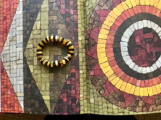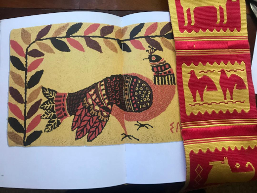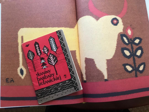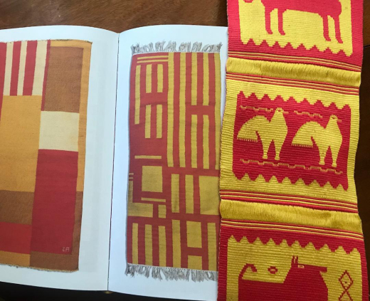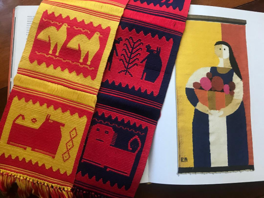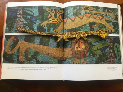 Then, I opened my well-worn copy of Hand-In-Hand and began to leaf through it and suddenly all my purchases began to make sense. I could see design elements of every single thing I had brought home in the images of the Ackerman’s own designs, particularly in Evelyn's work. I don’t know which came first, the chicken or the egg, that is, whether these items were inspirations for the Ackermans or whether they came after the pieces they seem to reference. It isn’t really important. All these items had either influenced their work or had subsequently appealed the Ackermans. In Evelyn’s wall hangings I can see the carved mane of the Swedish horse as well as the shapes of the trees on the cover of the little postcard book of Polish weavings. The color combinations of the textiles I chose are also right there in Evelyn’s own textile designs. The wooden sculpture of the man on the horse has the texture and folk quality of Evelyn’s wood carvings and bas-reliefs. My favorite purchase, the long, papier-mâché cat is reminiscent of the elongated cat in one of her loveliest wall hangings as well as the tiger and lion in one of her mosaics. Even the squared-off beads of the amber bracelet makes me think of glass mosaic tesserae. In the book there is a black and white photo of the Ackerman’s living room with one of the Greek needlepoint cushions similar to the one I had purchased on their Folke Ohlson Dux chair. Some of the Ackerman’s wall hangings had been produced in Greece. I saw firsthand that the colors, shapes and textures of Evelyn’s own joyful designs were the product her of her deep knowledge and love of traditional crafts and being surrounded by the endless stimuli of beautiful folk objects that the couple had collected throughout their lives
